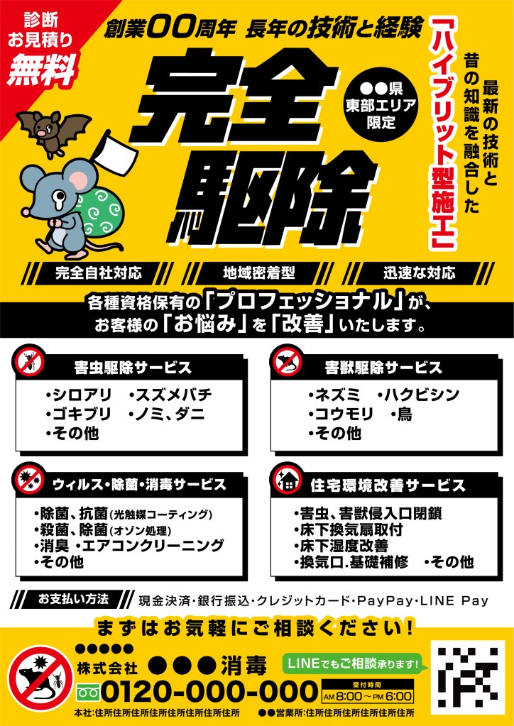 害虫・害獣駆除とのことでしたので危険色の黄色と黒、サブカラーに赤を使用しています。